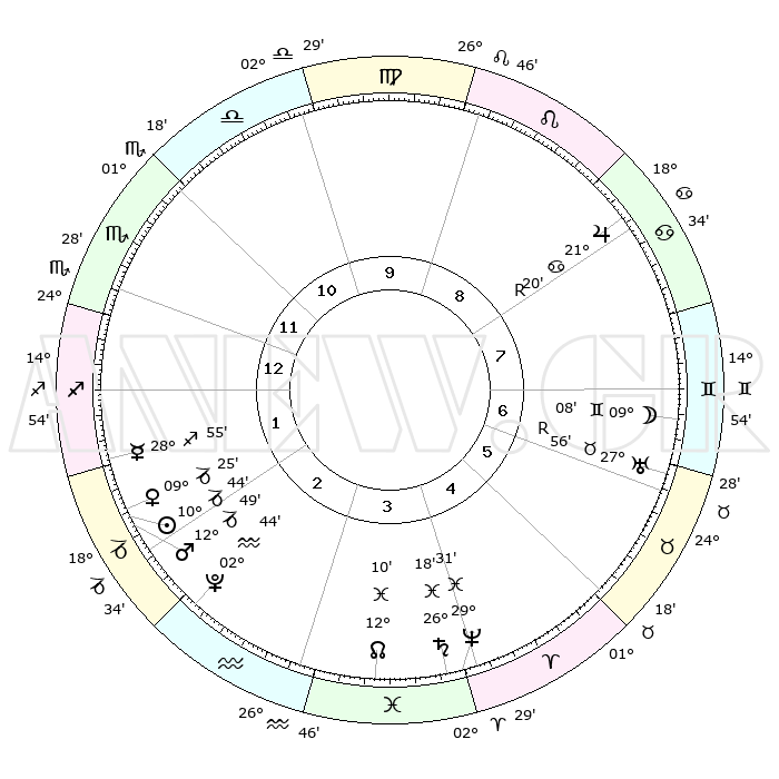 | | ΘΕΣΕΙΣ ΠΛΑΝΗΤΩΝ ΑΣΤΡΟΛΟΓΙΚΟΥ ΧΑΡΤΗ ΤΗΣ ΣΤΙΓΜΗΣ ΑΥΤΗΣ | | | | Πλανήτης | Ζώδιο | Μοίρες | Δεκαήμ. | Σε οίκο | Απόκλιση | | Ακμές των οίκων | | Ηλιος | Αιγόκερως | 10°40' | Δεύτερο | 2 | 23 S 00 | | 1ος | 24°08' | Σκορπιός | | Σελήνη | Δίδυμοι | 08°05' | Πρώτο | 7 | 26 N 38 | | 2ος | 24°32' | Τοξότης | | Ερμής | Τοξότης | 28°48' | Τρίτο | 2 | 24 S 00 | | 3ος | 29°18' | Αιγόκερως | | Αφροδίτη | Αιγόκερως | 09°20' | Πρώτο | 2 | 23 S 37 | | 4ος | 05°08' | Ιχθείς | | Αρης | Αιγόκερως | 12°46' | Δεύτερο | 2 | 23 S 42 | | 5ος | 06°49' | Κριός | | Δίας | Καρκίνος | 21°20'R | Τρίτο | 8 | 21 N 59 | | 6ος | 02°40' | Ταύρος | | Κρόνος | Ιχθείς | 26°18' | Τρίτο | 4 | 03 S 33 | | 7ος | 24°08' | Ταύρος | | Ουρανός | Ταύρος | 27°57'R | Τρίτο | 7 | 19 N 30 | | 8ος | 24°32' | Δίδυμοι | | Ποσειδώνας | Ιχθείς | 29°31' | Τρίτο | 4 | 01 S 25 | | 9ος | 29°18' | Καρκίνος | | Πλούτωνας | Υδροχόος | 02°44' | Πρώτο | 3 | 23 S 13 | | 10ος | 05°08' | Παρθένος | | Β. Δεσμός | Ιχθείς | 12°10' | Δεύτερο | 4 | 07 S 00 | | 11ος | 06°49' | Ζυγός | | Ωροσκόπος | Σκορπιός | 24°08' | Τρίτο | | | 12ος | 02°40' | Σκορπιός | | Μεσουράνημα | Παρθένος | 05°08' | Πρώτο | | | |