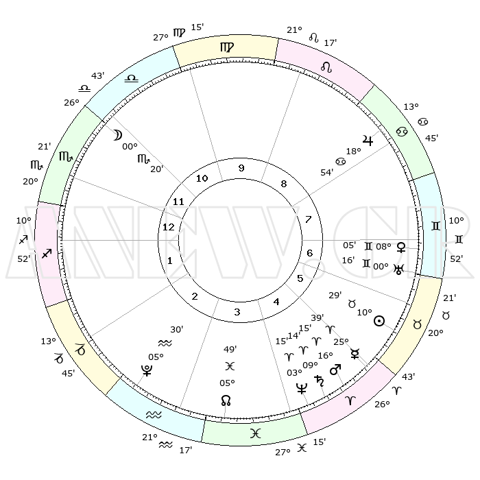 | | ΘΕΣΕΙΣ ΠΛΑΝΗΤΩΝ ΑΣΤΡΟΛΟΓΙΚΟΥ ΧΑΡΤΗ ΤΗΣ ΣΤΙΓΜΗΣ ΑΥΤΗΣ | | | | Πλανήτης | Ζώδιο | Μοίρες | Δεκαήμ. | Σε οίκο | Απόκλιση | | Ακμές των οίκων | | Ηλιος | Ταύρος | 10°26' | Δεύτερο | 6 | 14 N 57 | | 1ος | 28°09' | Σκορπιός | | Σελήνη | Ζυγός | 29°49' | Τρίτο | 11 | 15 S 10 | | 2ος | 29°02' | Τοξότης | | Ερμής | Κριός | 25°34' | Τρίτο | 5 | 08 N 04 | | 3ος | 04°26' | Υδροχόος | | Αφροδίτη | Δίδυμοι | 08°02' | Πρώτο | 7 | 22 N 31 | | 4ος | 10°25' | Ιχθείς | | Αρης | Κριός | 16°13' | Δεύτερο | 5 | 05 N 33 | | 5ος | 11°41' | Κριός | | Δίας | Καρκίνος | 18°53' | Δεύτερο | 8 | 22 N 29 | | 6ος | 06°59' | Ταύρος | | Κρόνος | Κριός | 09°14' | Πρώτο | 4 | 01 N 40 | | 7ος | 28°09' | Ταύρος | | Ουρανός | Δίδυμοι | 00°16' | Πρώτο | 7 | 20 N 02 | | 8ος | 29°02' | Δίδυμοι | | Ποσειδώνας | Κριός | 03°15' | Πρώτο | 4 | 00 N 05 | | 9ος | 04°26' | Λέων | | Πλούτωνας | Υδροχόος | 05°30' | Πρώτο | 3 | 22 S 49 | | 10ος | 10°25' | Παρθένος | | Β. Δεσμός | Ιχθείς | 05°50' | Πρώτο | 3 | 09 S 22 | | 11ος | 11°41' | Ζυγός | | Ωροσκόπος | Σκορπιός | 28°09' | Τρίτο | | | 12ος | 06°59' | Σκορπιός | | Μεσουράνημα | Παρθένος | 10°25' | Δεύτερο | | | |