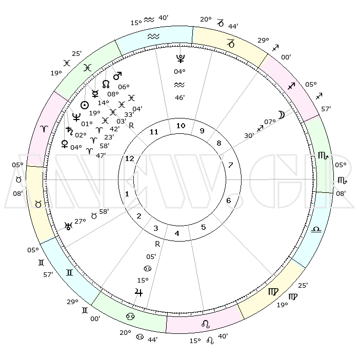 | | ΘΕΣΕΙΣ ΠΛΑΝΗΤΩΝ ΑΣΤΡΟΛΟΓΙΚΟΥ ΧΑΡΤΗ ΤΗΣ ΣΤΙΓΜΗΣ ΑΥΤΗΣ | | | | Πλανήτης | Ζώδιο | Μοίρες | Δεκαήμ. | Σε οίκο | Απόκλιση | | Ακμές των οίκων | | Ηλιος | Ιχθείς | 19°39' | Δεύτερο | 12 | 04 S 06 | | 1ος | 28°57' | Ιχθείς | | Σελήνη | Τοξότης | 06°45' | Πρώτο | 8 | 26 S 37 | | 2ος | 09°30' | Ταύρος | | Ερμής | Ιχθείς | 14°07'R | Δεύτερο | 12 | 03 S 09 | | 3ος | 07°04' | Δίδυμοι | | Αφροδίτη | Κριός | 04°42' | Πρώτο | 1 | 00 N 47 | | 4ος | 29°25' | Δίδυμοι | | Αρης | Ιχθείς | 06°01' | Πρώτο | 12 | 10 S 19 | | 5ος | 21°40' | Καρκίνος | | Δίας | Καρκίνος | 15°05'R | Δεύτερο | 4 | 22 N 56 | | 6ος | 18°55' | Λέων | | Κρόνος | Κριός | 02°57' | Πρώτο | 1 | 00 S 47 | | 7ος | 28°57' | Παρθένος | | Ουρανός | Ταύρος | 27°58' | Τρίτο | 2 | 19 N 32 | | 8ος | 09°30' | Σκορπιός | | Ποσειδώνας | Κριός | 01°23' | Πρώτο | 1 | 00 S 39 | | 9ος | 07°04' | Τοξότης | | Πλούτωνας | Υδροχόος | 04°46' | Πρώτο | 11 | 22 S 50 | | 10ος | 29°25' | Τοξότης | | Β. Δεσμός | Ιχθείς | 08°33' | Πρώτο | 12 | 08 S 22 | | 11ος | 21°40' | Αιγόκερως | | Ωροσκόπος | Ιχθείς | 28°57' | Τρίτο | | | 12ος | 18°55' | Υδροχόος | | Μεσουράνημα | Τοξότης | 29°25' | Τρίτο | | | |