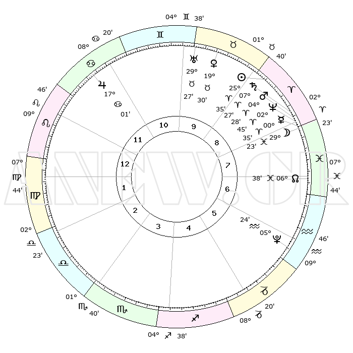 | | ΘΕΣΕΙΣ ΠΛΑΝΗΤΩΝ ΑΣΤΡΟΛΟΓΙΚΟΥ ΧΑΡΤΗ ΤΗΣ ΣΤΙΓΜΗΣ ΑΥΤΗΣ | | | | Πλανήτης | Ζώδιο | Μοίρες | Δεκαήμ. | Σε οίκο | Απόκλιση | | Ακμές των οίκων | | Ηλιος | Κριός | 25°30' | Τρίτο | 9 | 09 N 52 | | 1ος | 14°56' | Λέων | | Σελήνη | Ιχθείς | 28°17' | Τρίτο | 8 | 00 N 57 | | 2ος | 07°13' | Παρθένος | | Ερμής | Κριός | 00°28' | Πρώτο | 8 | 02 S 12 | | 3ος | 04°15' | Ζυγός | | Αφροδίτη | Ταύρος | 19°24' | Δεύτερο | 10 | 17 N 46 | | 4ος | 06°40' | Σκορπιός | | Αρης | Κριός | 04°24' | Πρώτο | 9 | 00 N 51 | | 5ος | 11°57' | Τοξότης | | Δίας | Καρκίνος | 17°01' | Δεύτερο | 12 | 22 N 44 | | 6ος | 15°27' | Αιγόκερως | | Κρόνος | Κριός | 07°26' | Πρώτο | 9 | 00 N 59 | | 7ος | 14°56' | Υδροχόος | | Ουρανός | Ταύρος | 29°27' | Τρίτο | 10 | 19 N 52 | | 8ος | 07°13' | Ιχθείς | | Ποσειδώνας | Κριός | 02°44' | Πρώτο | 8 | 00 S 07 | | 9ος | 04°15' | Κριός | | Πλούτωνας | Υδροχόος | 05°24' | Πρώτο | 6 | 22 S 47 | | 10ος | 06°40' | Ταύρος | | Β. Δεσμός | Ιχθείς | 06°38' | Πρώτο | 7 | 09 S 04 | | 11ος | 11°57' | Δίδυμοι | | Ωροσκόπος | Λέων | 14°56' | Δεύτερο | | | 12ος | 15°27' | Καρκίνος | | Μεσουράνημα | Ταύρος | 06°40' | Πρώτο | | | |