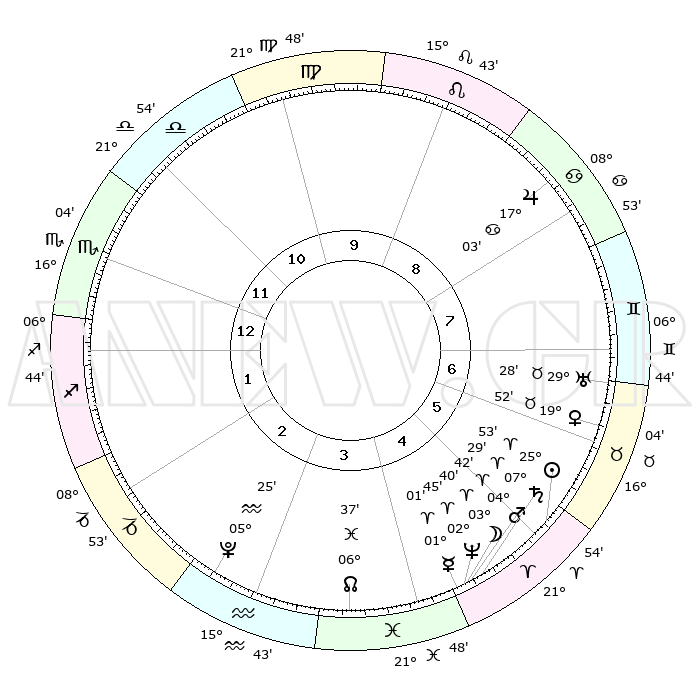 | | ΘΕΣΕΙΣ ΠΛΑΝΗΤΩΝ ΑΣΤΡΟΛΟΓΙΚΟΥ ΧΑΡΤΗ ΤΗΣ ΣΤΙΓΜΗΣ ΑΥΤΗΣ | | | | Πλανήτης | Ζώδιο | Μοίρες | Δεκαήμ. | Σε οίκο | Απόκλιση | | Ακμές των οίκων | | Ηλιος | Κριός | 25°48' | Τρίτο | 6 | 09 N 58 | | 1ος | 15°40' | Σκορπιός | | Σελήνη | Κριός | 02°39' | Πρώτο | 5 | 03 N 01 | | 2ος | 15°12' | Τοξότης | | Ερμής | Κριός | 00°54' | Πρώτο | 5 | 02 S 02 | | 3ος | 18°46' | Αιγόκερως | | Αφροδίτη | Ταύρος | 19°46' | Δεύτερο | 7 | 17 N 53 | | 4ος | 24°05' | Υδροχόος | | Αρης | Κριός | 04°38' | Πρώτο | 5 | 00 N 57 | | 5ος | 26°28' | Ιχθείς | | Δίας | Καρκίνος | 17°03' | Δεύτερο | 8 | 22 N 43 | | 6ος | 23°25' | Κριός | | Κρόνος | Κριός | 07°29' | Πρώτο | 5 | 01 N 00 | | 7ος | 15°40' | Ταύρος | | Ουρανός | Ταύρος | 29°28' | Τρίτο | 7 | 19 N 52 | | 8ος | 15°12' | Δίδυμοι | | Ποσειδώνας | Κριός | 02°45' | Πρώτο | 5 | 00 S 07 | | 9ος | 18°46' | Καρκίνος | | Πλούτωνας | Υδροχόος | 05°24' | Πρώτο | 3 | 22 S 47 | | 10ος | 24°05' | Λέων | | Β. Δεσμός | Ιχθείς | 06°37' | Πρώτο | 4 | 09 S 05 | | 11ος | 26°28' | Παρθένος | | Ωροσκόπος | Σκορπιός | 15°40' | Δεύτερο | | | 12ος | 23°25' | Ζυγός | | Μεσουράνημα | Λέων | 24°05' | Τρίτο | | | |