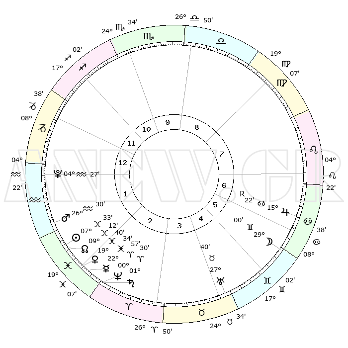 | | ΘΕΣΕΙΣ ΠΛΑΝΗΤΩΝ ΑΣΤΡΟΛΟΓΙΚΟΥ ΧΑΡΤΗ ΤΗΣ ΣΤΙΓΜΗΣ ΑΥΤΗΣ | | | | Πλανήτης | Ζώδιο | Μοίρες | Δεκαήμ. | Σε οίκο | Απόκλιση | | Ακμές των οίκων | | Ηλιος | Ιχθείς | 07°29' | Πρώτο | 2 | 08 S 46 | | 1ος | 10°39' | Αιγόκερως | | Σελήνη | Δίδυμοι | 28°09' | Τρίτο | 6 | 28 N 25 | | 2ος | 20°31' | Υδροχόος | | Ερμής | Ιχθείς | 22°34' | Τρίτο | 2 | 00 S 26 | | 3ος | 00°48' | Κριός | | Αφροδίτη | Ιχθείς | 19°35' | Δεύτερο | 2 | 05 S 24 | | 4ος | 02°52' | Ταύρος | | Αρης | Υδροχόος | 26°27' | Τρίτο | 2 | 13 S 43 | | 5ος | 27°37' | Ταύρος | | Δίας | Καρκίνος | 15°22'R | Δεύτερο | 7 | 22 N 53 | | 6ος | 18°56' | Δίδυμοι | | Κρόνος | Κριός | 01°30' | Πρώτο | 3 | 01 S 22 | | 7ος | 10°39' | Καρκίνος | | Ουρανός | Ταύρος | 27°40' | Τρίτο | 5 | 19 N 28 | | 8ος | 20°31' | Λέων | | Ποσειδώνας | Κριός | 00°57' | Πρώτο | 3 | 00 S 49 | | 9ος | 00°48' | Ζυγός | | Πλούτωνας | Υδροχόος | 04°27' | Πρώτο | 1 | 22 S 53 | | 10ος | 02°52' | Σκορπιός | | Β. Δεσμός | Ιχθείς | 09°12' | Πρώτο | 2 | 08 S 07 | | 11ος | 27°37' | Σκορπιός | | Ωροσκόπος | Αιγόκερως | 10°39' | Δεύτερο | | | 12ος | 18°56' | Τοξότης | | Μεσουράνημα | Σκορπιός | 02°52' | Πρώτο | | | |