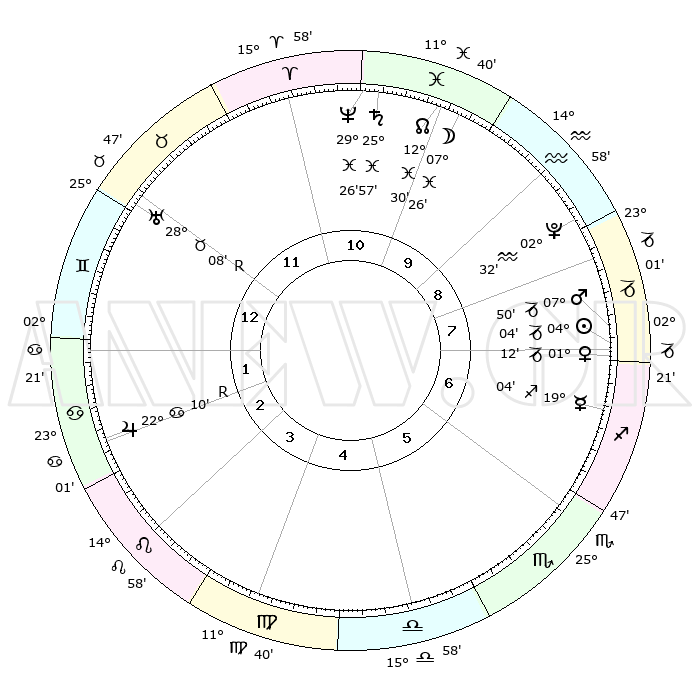| | ΘΕΣΕΙΣ ΠΛΑΝΗΤΩΝ ΑΣΤΡΟΛΟΓΙΚΟΥ ΧΑΡΤΗ ΤΗΣ ΣΤΙΓΜΗΣ ΑΥΤΗΣ | | | | Πλανήτης | Ζώδιο | Μοίρες | Δεκαήμ. | Σε οίκο | Απόκλιση | | Ακμές των οίκων | | Ηλιος | Αιγόκερως | 03°59' | Πρώτο | 8 | 23 S 22 | | 1ος | 29°30' | Ταύρος | | Σελήνη | Ιχθείς | 06°17' | Πρώτο | 10 | 09 S 37 | | 2ος | 24°25' | Δίδυμοι | | Ερμής | Τοξότης | 18°56' | Δεύτερο | 7 | 22 S 47 | | 3ος | 15°51' | Καρκίνος | | Αφροδίτη | Αιγόκερως | 01°05' | Πρώτο | 8 | 23 S 41 | | 4ος | 08°35' | Λέων | | Αρης | Αιγόκερως | 07°46' | Πρώτο | 8 | 24 S 03 | | 5ος | 06°57' | Παρθένος | | Δίας | Καρκίνος | 22°10'R | Τρίτο | 3 | 21 N 50 | | 6ος | 15°19' | Ζυγός | | Κρόνος | Ιχθείς | 25°57' | Τρίτο | 11 | 03 S 42 | | 7ος | 29°30' | Σκορπιός | | Ουρανός | Ταύρος | 28°08'R | Τρίτο | 12 | 19 N 33 | | 8ος | 24°25' | Τοξότης | | Ποσειδώνας | Ιχθείς | 29°26' | Τρίτο | 11 | 01 S 27 | | 9ος | 15°51' | Αιγόκερως | | Πλούτωνας | Υδροχόος | 02°32' | Πρώτο | 9 | 23 S 16 | | 10ος | 08°35' | Υδροχόος | | Β. Δεσμός | Ιχθείς | 12°31' | Δεύτερο | 11 | 06 S 52 | | 11ος | 06°57' | Ιχθείς | | Ωροσκόπος | Ταύρος | 29°30' | Τρίτο | | | 12ος | 15°19' | Κριός | | Μεσουράνημα | Υδροχόος | 08°35' | Πρώτο | | | |
