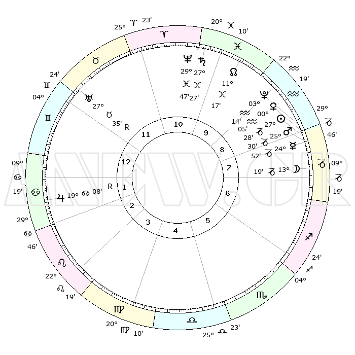 | | ΘΕΣΕΙΣ ΠΛΑΝΗΤΩΝ ΑΣΤΡΟΛΟΓΙΚΟΥ ΧΑΡΤΗ ΤΗΣ ΣΤΙΓΜΗΣ ΑΥΤΗΣ | | | | Πλανήτης | Ζώδιο | Μοίρες | Δεκαήμ. | Σε οίκο | Απόκλιση | | Ακμές των οίκων | | Ηλιος | Αιγόκερως | 27°24' | Τρίτο | 8 | 20 S 41 | | 1ος | 14°20' | Δίδυμοι | | Σελήνη | Αιγόκερως | 12°25' | Δεύτερο | 8 | 27 S 09 | | 2ος | 06°41' | Καρκίνος | | Ερμής | Αιγόκερως | 24°44' | Τρίτο | 8 | 23 S 03 | | 3ος | 27°54' | Καρκίνος | | Αφροδίτη | Αιγόκερως | 29°59' | Τρίτο | 9 | 21 S 10 | | 4ος | 22°02' | Λέων | | Αρης | Αιγόκερως | 25°26' | Τρίτο | 8 | 22 S 01 | | 5ος | 23°08' | Παρθένος | | Δίας | Καρκίνος | 19°09'R | Δεύτερο | 2 | 22 N 20 | | 6ος | 03°12' | Σκορπιός | | Κρόνος | Ιχθείς | 27°27' | Τρίτο | 11 | 03 S 03 | | 7ος | 14°20' | Τοξότης | | Ουρανός | Ταύρος | 27°35'R | Τρίτο | 12 | 19 N 26 | | 8ος | 06°41' | Αιγόκερως | | Ποσειδώνας | Ιχθείς | 29°47' | Τρίτο | 11 | 01 S 18 | | 9ος | 27°54' | Αιγόκερως | | Πλούτωνας | Υδροχόος | 03°14' | Πρώτο | 9 | 23 S 07 | | 10ος | 22°02' | Υδροχόος | | Β. Δεσμός | Ιχθείς | 11°18' | Δεύτερο | 10 | 07 S 20 | | 11ος | 23°08' | Ιχθείς | | Ωροσκόπος | Δίδυμοι | 14°20' | Δεύτερο | | | 12ος | 03°12' | Ταύρος | | Μεσουράνημα | Υδροχόος | 22°02' | Τρίτο | | | |