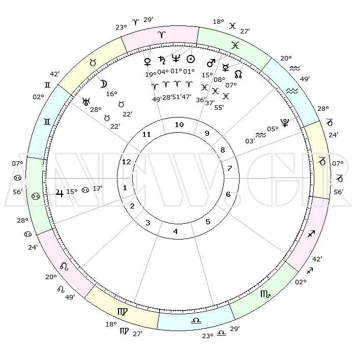 | | ΘΕΣΕΙΣ ΠΛΑΝΗΤΩΝ ΑΣΤΡΟΛΟΓΙΚΟΥ ΧΑΡΤΗ ΤΗΣ ΣΤΙΓΜΗΣ ΑΥΤΗΣ | | | | Πλανήτης | Ζώδιο | Μοίρες | Δεκαήμ. | Σε οίκο | Απόκλιση | | Ακμές των οίκων | | Ηλιος | Κριός | 01°42' | Πρώτο | 11 | 00 N 41 | | 1ος | 07°32' | Δίδυμοι | | Σελήνη | Ταύρος | 15°06' | Δεύτερο | 12 | 20 N 57 | | 2ος | 00°56' | Καρκίνος | | Ερμής | Ιχθείς | 08°36' | Πρώτο | 10 | 07 S 46 | | 3ος | 22°11' | Καρκίνος | | Αφροδίτη | Κριός | 19°42' | Δεύτερο | 11 | 06 N 57 | | 4ος | 15°35' | Λέων | | Αρης | Ιχθείς | 15°32' | Δεύτερο | 11 | 06 S 41 | | 5ος | 15°24' | Παρθένος | | Δίας | Καρκίνος | 15°17' | Δεύτερο | 2 | 22 N 55 | | 6ος | 24°52' | Ζυγός | | Κρόνος | Κριός | 04°27' | Πρώτο | 11 | 00 S 11 | | 7ος | 07°32' | Τοξότης | | Ουρανός | Ταύρος | 28°22' | Τρίτο | 12 | 19 N 37 | | 8ος | 00°56' | Αιγόκερως | | Ποσειδώνας | Κριός | 01°51' | Πρώτο | 11 | 00 S 28 | | 9ος | 22°11' | Αιγόκερως | | Πλούτωνας | Υδροχόος | 05°03' | Πρώτο | 9 | 22 S 48 | | 10ος | 15°35' | Υδροχόος | | Β. Δεσμός | Ιχθείς | 07°55' | Πρώτο | 10 | 08 S 36 | | 11ος | 15°24' | Ιχθείς | | Ωροσκόπος | Δίδυμοι | 07°32' | Πρώτο | | | 12ος | 24°52' | Κριός | | Μεσουράνημα | Υδροχόος | 15°35' | Δεύτερο | | | |