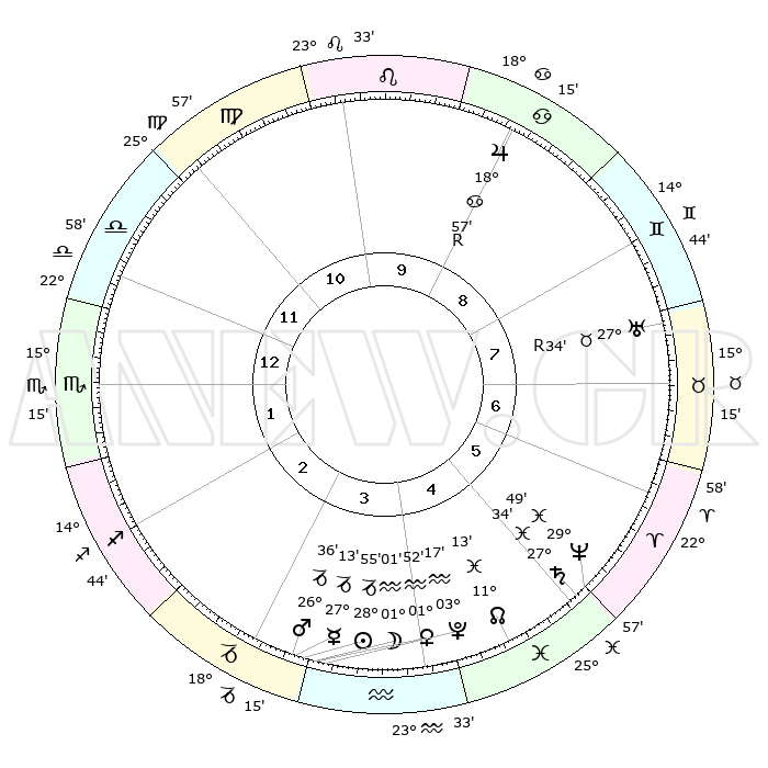 | | ΘΕΣΕΙΣ ΠΛΑΝΗΤΩΝ ΑΣΤΡΟΛΟΓΙΚΟΥ ΧΑΡΤΗ ΤΗΣ ΣΤΙΓΜΗΣ ΑΥΤΗΣ | | | | Πλανήτης | Ζώδιο | Μοίρες | Δεκαήμ. | Σε οίκο | Απόκλιση | | Ακμές των οίκων | | Ηλιος | Αιγόκερως | 28°51' | Τρίτο | 4 | 20 S 23 | | 1ος | 23°52' | Ζυγός | | Σελήνη | Υδροχόος | 00°06' | Πρώτο | 4 | 23 S 20 | | 2ος | 21°55' | Σκορπιός | | Ερμής | Αιγόκερως | 27°05' | Τρίτο | 3 | 22 S 40 | | 3ος | 23°27' | Τοξότης | | Αφροδίτη | Υδροχόος | 01°47' | Πρώτο | 4 | 20 S 49 | | 4ος | 27°15' | Αιγόκερως | | Αρης | Αιγόκερως | 26°33' | Τρίτο | 3 | 21 S 49 | | 5ος | 00°12' | Ιχθείς | | Δίας | Καρκίνος | 18°57'R | Δεύτερο | 9 | 22 N 22 | | 6ος | 29°23' | Ιχθείς | | Κρόνος | Ιχθείς | 27°34' | Τρίτο | 5 | 03 S 00 | | 7ος | 23°52' | Κριός | | Ουρανός | Ταύρος | 27°34'R | Τρίτο | 8 | 19 N 26 | | 8ος | 21°55' | Ταύρος | | Ποσειδώνας | Ιχθείς | 29°49' | Τρίτο | 6 | 01 S 17 | | 9ος | 23°27' | Δίδυμοι | | Πλούτωνας | Υδροχόος | 03°17' | Πρώτο | 4 | 23 S 06 | | 10ος | 27°15' | Καρκίνος | | Β. Δεσμός | Ιχθείς | 11°13' | Δεύτερο | 5 | 07 S 21 | | 11ος | 00°12' | Παρθένος | | Ωροσκόπος | Ζυγός | 23°52' | Τρίτο | | | 12ος | 29°23' | Παρθένος | | Μεσουράνημα | Καρκίνος | 27°15' | Τρίτο | | | |