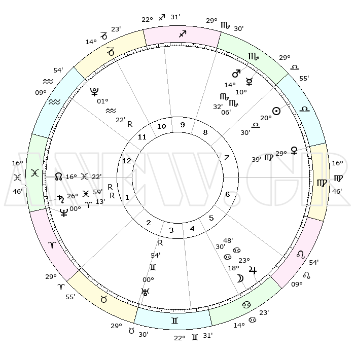 | ΘΕΣΕΙΣ ΠΛΑΝΗΤΩΝ ΑΣΤΡΟΛΟΓΙΚΟΥ ΧΑΡΤΗ ΤΗΣ ΣΤΙΓΜΗΣ ΑΥΤΗΣ | | Πλανήτης | Ζώδιο | Μοίρες | Δεκαήμ. | Σε οίκο | Απόκλιση | | Ακμές των οίκων | Ηλιος | Ζυγός | 20°25' | Τρίτο | 8 | 07 S 58 | | 1ος | 29°56' | Αιγόκερως | Σελήνη | Καρκίνος | 17°13' | Δεύτερο | 6 | 26 N 50 | | 2ος | 14°01' | Ιχθείς | Ερμής | Σκορπιός | 09°58' | Πρώτο | 9 | 16 S 17 | | 3ος | 22°29' | Κριός | Αφροδίτη | Παρθένος | 29°32' | Τρίτο | 8 | 01 N 33 | | 4ος | 20°57' | Ταύρος | Αρης | Σκορπιός | 14°28' | Δεύτερο | 9 | 16 S 23 | | 5ος | 13°43' | Δίδυμοι | Δίας | Καρκίνος | 23°48' | Τρίτο | 6 | 21 N 23 | | 6ος | 05°08' | Καρκίνος | Κρόνος | Ιχθείς | 26°59'R | Τρίτο | 2 | 03 S 30 | | 7ος | 29°56' | Καρκίνος | Ουρανός | Δίδυμοι | 00°54'R | Πρώτο | 4 | 20 N 08 | | 8ος | 14°01' | Παρθένος | Ποσειδώνας | Κριός | 00°13'R | Πρώτο | 2 | 01 S 11 | | 9ος | 22°29' | Ζυγός | Πλούτωνας | Υδροχόος | 01°22'R | Πρώτο | 1 | 23 S 32 | | 10ος | 20°57' | Σκορπιός | Β. Δεσμός | Ιχθείς | 16°23' | Δεύτερο | 2 | 05 S 22 | | 11ος | 13°43' | Τοξότης | Ωροσκόπος | Αιγόκερως | 29°56' | Τρίτο | | | 12ος | 05°08' | Αιγόκερως | Μεσουράνημα | Σκορπιός | 20°57' | Τρίτο | | | |