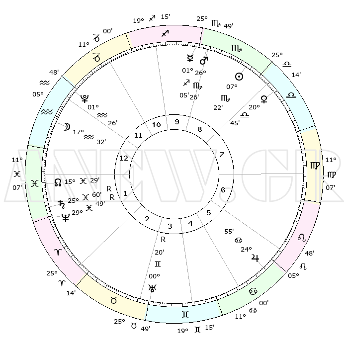| | ΘΕΣΕΙΣ ΠΛΑΝΗΤΩΝ ΑΣΤΡΟΛΟΓΙΚΟΥ ΧΑΡΤΗ ΤΗΣ ΣΤΙΓΜΗΣ ΑΥΤΗΣ | | | | Πλανήτης | Ζώδιο | Μοίρες | Δεκαήμ. | Σε οίκο | Απόκλιση | | Ακμές των οίκων | | Ηλιος | Σκορπιός | 07°07' | Πρώτο | 11 | 13 S 53 | | 1ος | 04°58' | Τοξότης | | Σελήνη | Υδροχόος | 14°23' | Δεύτερο | 3 | 19 S 10 | | 2ος | 06°50' | Αιγόκερως | | Ερμής | Τοξότης | 00°51' | Πρώτο | 12 | 23 S 08 | | 3ος | 13°23' | Υδροχόος | | Αφροδίτη | Ζυγός | 20°27' | Τρίτο | 11 | 06 S 36 | | 4ος | 19°28' | Ιχθείς | | Αρης | Σκορπιός | 26°16' | Τρίτο | 12 | 19 S 41 | | 5ος | 19°50' | Κριός | | Δίας | Καρκίνος | 24°54' | Τρίτο | 8 | 21 N 13 | | 6ος | 14°13' | Ταύρος | | Κρόνος | Ιχθείς | 26°00'R | Τρίτο | 4 | 03 S 51 | | 7ος | 04°58' | Δίδυμοι | | Ουρανός | Δίδυμοι | 00°20'R | Πρώτο | 6 | 20 N 01 | | 8ος | 06°50' | Καρκίνος | | Ποσειδώνας | Ιχθείς | 29°49'R | Τρίτο | 4 | 01 S 20 | | 9ος | 13°23' | Λέων | | Πλούτωνας | Υδροχόος | 01°26' | Πρώτο | 2 | 23 S 31 | | 10ος | 19°28' | Παρθένος | | Β. Δεσμός | Ιχθείς | 15°29' | Δεύτερο | 3 | 05 S 43 | | 11ος | 19°50' | Ζυγός | | Ωροσκόπος | Τοξότης | 04°58' | Πρώτο | | | 12ος | 14°13' | Σκορπιός | | Μεσουράνημα | Παρθένος | 19°28' | Δεύτερο | | | |