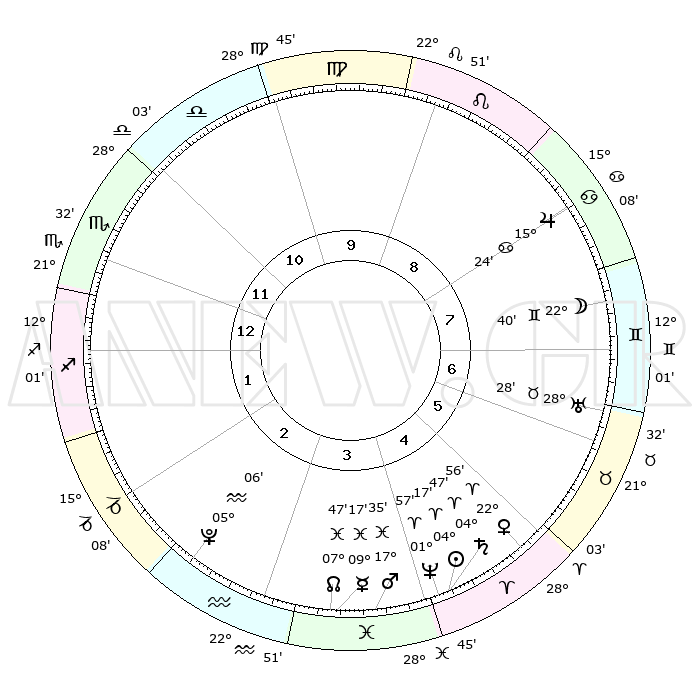 | | ΘΕΣΕΙΣ ΠΛΑΝΗΤΩΝ ΑΣΤΡΟΛΟΓΙΚΟΥ ΧΑΡΤΗ ΤΗΣ ΣΤΙΓΜΗΣ ΑΥΤΗΣ | | | | Πλανήτης | Ζώδιο | Μοίρες | Δεκαήμ. | Σε οίκο | Απόκλιση | | Ακμές των οίκων | | Ηλιος | Κριός | 04°13' | Πρώτο | 5 | 01 N 40 | | 1ος | 20°23' | Σκορπιός | | Σελήνη | Δίδυμοι | 21°37' | Τρίτο | 8 | 28 N 15 | | 2ος | 20°22' | Τοξότης | | Ερμής | Ιχθείς | 09°15' | Πρώτο | 4 | 08 S 03 | | 3ος | 24°34' | Αιγόκερως | | Αφροδίτη | Κριός | 22°50' | Τρίτο | 5 | 08 N 12 | | 4ος | 00°12' | Ιχθείς | | Αρης | Ιχθείς | 17°31' | Δεύτερο | 4 | 05 S 55 | | 5ος | 02°14' | Κριός | | Δίας | Καρκίνος | 15°23' | Δεύτερο | 8 | 22 N 55 | | 6ος | 28°35' | Κριός | | Κρόνος | Κριός | 04°46' | Πρώτο | 5 | 00 S 03 | | 7ος | 20°23' | Ταύρος | | Ουρανός | Ταύρος | 28°28' | Τρίτο | 7 | 19 N 39 | | 8ος | 20°22' | Δίδυμοι | | Ποσειδώνας | Κριός | 01°56' | Πρώτο | 4 | 00 S 26 | | 9ος | 24°35' | Καρκίνος | | Πλούτωνας | Υδροχόος | 05°06' | Πρώτο | 3 | 22 S 48 | | 10ος | 00°12' | Παρθένος | | Β. Δεσμός | Ιχθείς | 07°47' | Πρώτο | 4 | 08 S 39 | | 11ος | 02°14' | Ζυγός | | Ωροσκόπος | Σκορπιός | 20°23' | Τρίτο | | | 12ος | 28°35' | Ζυγός | | Μεσουράνημα | Παρθένος | 00°12' | Πρώτο | | | |