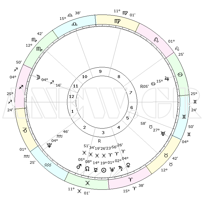 | | ΘΕΣΕΙΣ ΠΛΑΝΗΤΩΝ ΑΣΤΡΟΛΟΓΙΚΟΥ ΧΑΡΤΗ ΤΗΣ ΣΤΙΓΜΗΣ ΑΥΤΗΣ | | | | Πλανήτης | Ζώδιο | Μοίρες | Δεκαήμ. | Σε οίκο | Απόκλιση | | Ακμές των οίκων | | Ηλιος | Ιχθείς | 19°23' | Δεύτερο | 3 | 04 S 12 | | 1ος | 08°54' | Τοξότης | | Σελήνη | Τοξότης | 03°38' | Πρώτο | 12 | 26 S 02 | | 2ος | 11°26' | Αιγόκερως | | Ερμής | Ιχθείς | 14°22'R | Δεύτερο | 3 | 03 S 01 | | 3ος | 18°38' | Υδροχόος | | Αφροδίτη | Κριός | 04°22' | Πρώτο | 4 | 00 N 39 | | 4ος | 24°40' | Ιχθείς | | Αρης | Ιχθείς | 05°49' | Πρώτο | 3 | 10 S 24 | | 5ος | 24°27' | Κριός | | Δίας | Καρκίνος | 15°05'R | Δεύτερο | 8 | 22 N 56 | | 6ος | 18°20' | Ταύρος | | Κρόνος | Κριός | 02°55' | Πρώτο | 4 | 00 S 47 | | 7ος | 08°54' | Δίδυμοι | | Ουρανός | Ταύρος | 27°58' | Τρίτο | 6 | 19 N 32 | | 8ος | 11°26' | Καρκίνος | | Ποσειδώνας | Κριός | 01°23' | Πρώτο | 4 | 00 S 39 | | 9ος | 18°38' | Λέων | | Πλούτωνας | Υδροχόος | 04°46' | Πρώτο | 2 | 22 S 50 | | 10ος | 24°40' | Παρθένος | | Β. Δεσμός | Ιχθείς | 08°34' | Πρώτο | 3 | 08 S 21 | | 11ος | 24°27' | Ζυγός | | Ωροσκόπος | Τοξότης | 08°54' | Πρώτο | | | 12ος | 18°20' | Σκορπιός | | Μεσουράνημα | Παρθένος | 24°40' | Τρίτο | | | |