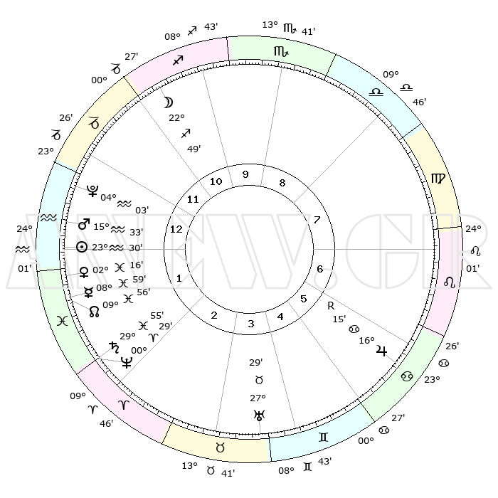 | | ΘΕΣΕΙΣ ΠΛΑΝΗΤΩΝ ΑΣΤΡΟΛΟΓΙΚΟΥ ΧΑΡΤΗ ΤΗΣ ΣΤΙΓΜΗΣ ΑΥΤΗΣ | | | | Πλανήτης | Ζώδιο | Μοίρες | Δεκαήμ. | Σε οίκο | Απόκλιση | | Ακμές των οίκων | | Ηλιος | Υδροχόος | 23°26' | Τρίτο | 1 | 13 S 42 | | 1ος | 24°56' | Αιγόκερως | | Σελήνη | Τοξότης | 22°04' | Τρίτο | 11 | 28 S 19 | | 2ος | 08°06' | Ιχθείς | | Ερμής | Ιχθείς | 08°53' | Πρώτο | 2 | 08 S 44 | | 3ος | 17°17' | Κριός | | Αφροδίτη | Ιχθείς | 02°11' | Πρώτο | 1 | 12 S 04 | | 4ος | 16°39' | Ταύρος | | Αρης | Υδροχόος | 15°30' | Δεύτερο | 1 | 17 S 13 | | 5ος | 09°49' | Δίδυμοι | | Δίας | Καρκίνος | 16°15'R | Δεύτερο | 6 | 22 N 46 | | 6ος | 01°06' | Καρκίνος | | Κρόνος | Ιχθείς | 29°55' | Τρίτο | 2 | 02 S 01 | | 7ος | 24°56' | Καρκίνος | | Ουρανός | Ταύρος | 27°29' | Τρίτο | 4 | 19 N 25 | | 8ος | 08°06' | Παρθένος | | Ποσειδώνας | Κριός | 00°29' | Πρώτο | 2 | 01 S 01 | | 9ος | 17°17' | Ζυγός | | Πλούτωνας | Υδροχόος | 04°03' | Πρώτο | 1 | 22 S 57 | | 10ος | 16°39' | Σκορπιός | | Β. Δεσμός | Ιχθείς | 09°56' | Πρώτο | 2 | 07 S 50 | | 11ος | 09°49' | Τοξότης | | Ωροσκόπος | Αιγόκερως | 24°56' | Τρίτο | | | 12ος | 01°06' | Αιγόκερως | | Μεσουράνημα | Σκορπιός | 16°39' | Δεύτερο | | | |