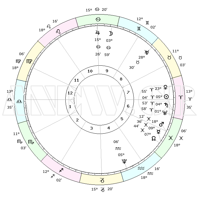 | | ΘΕΣΕΙΣ ΠΛΑΝΗΤΩΝ ΑΣΤΡΟΛΟΓΙΚΟΥ ΧΑΡΤΗ ΤΗΣ ΣΤΙΓΜΗΣ ΑΥΤΗΣ | | | | Πλανήτης | Ζώδιο | Μοίρες | Δεκαήμ. | Σε οίκο | Απόκλιση | | Ακμές των οίκων | | Ηλιος | Κριός | 05°01' | Πρώτο | 7 | 01 N 59 | | 1ος | 24°45' | Παρθένος | | Σελήνη | Καρκίνος | 03°05' | Πρώτο | 10 | 28 N 10 | | 2ος | 20°57' | Ζυγός | | Ερμής | Ιχθείς | 09°34' | Πρώτο | 6 | 08 S 06 | | 3ος | 21°10' | Σκορπιός | | Αφροδίτη | Κριός | 23°50' | Τρίτο | 8 | 08 N 36 | | 4ος | 24°06' | Τοξότης | | Αρης | Ιχθείς | 18°09' | Δεύτερο | 6 | 05 S 40 | | 5ος | 27°10' | Αιγόκερως | | Δίας | Καρκίνος | 15°26' | Δεύτερο | 10 | 22 N 54 | | 6ος | 27°48' | Υδροχόος | | Κρόνος | Κριός | 04°52' | Πρώτο | 7 | 00 S 01 | | 7ος | 24°45' | Ιχθείς | | Ουρανός | Ταύρος | 28°30' | Τρίτο | 9 | 19 N 39 | | 8ος | 20°57' | Κριός | | Ποσειδώνας | Κριός | 01°58' | Πρώτο | 7 | 00 S 25 | | 9ος | 21°10' | Ταύρος | | Πλούτωνας | Υδροχόος | 05°06' | Πρώτο | 5 | 22 S 48 | | 10ος | 24°06' | Δίδυμοι | | Β. Δεσμός | Ιχθείς | 07°44' | Πρώτο | 6 | 08 S 40 | | 11ος | 27°10' | Καρκίνος | | Ωροσκόπος | Παρθένος | 24°45' | Τρίτο | | | 12ος | 27°48' | Λέων | | Μεσουράνημα | Δίδυμοι | 24°06' | Τρίτο | | | |