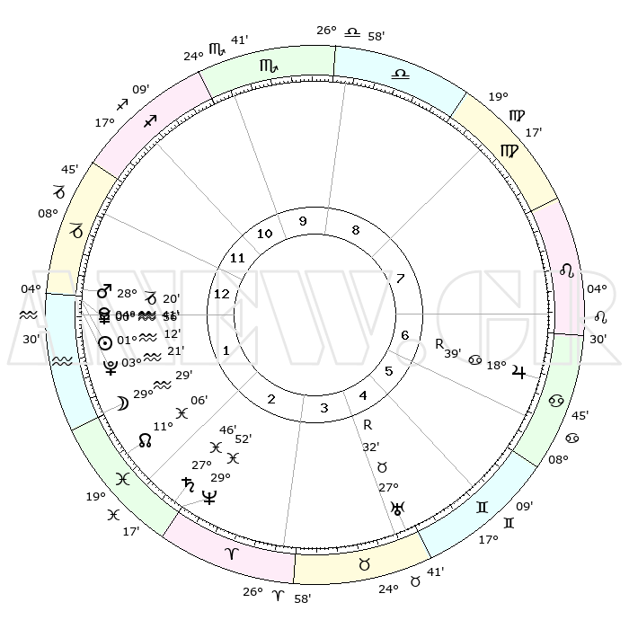 | | ΘΕΣΕΙΣ ΠΛΑΝΗΤΩΝ ΑΣΤΡΟΛΟΓΙΚΟΥ ΧΑΡΤΗ ΤΗΣ ΣΤΙΓΜΗΣ ΑΥΤΗΣ | | | | Πλανήτης | Ζώδιο | Μοίρες | Δεκαήμ. | Σε οίκο | Απόκλιση | | Ακμές των οίκων | | Ηλιος | Υδροχόος | 01°07' | Πρώτο | 1 | 19 S 54 | | 1ος | 04°26' | Αιγόκερως | | Σελήνη | Υδροχόος | 28°29' | Τρίτο | 2 | 12 S 55 | | 2ος | 12°43' | Υδροχόος | | Ερμής | Υδροχόος | 00°48' | Πρώτο | 1 | 21 S 58 | | 3ος | 22°57' | Ιχθείς | | Αφροδίτη | Υδροχόος | 04°35' | Πρώτο | 1 | 20 S 13 | | 4ος | 26°09' | Κριός | | Αρης | Αιγόκερως | 28°17' | Τρίτο | 1 | 21 S 29 | | 5ος | 21°47' | Ταύρος | | Δίας | Καρκίνος | 18°40'R | Δεύτερο | 7 | 22 N 25 | | 6ος | 13°20' | Δίδυμοι | | Κρόνος | Ιχθείς | 27°45' | Τρίτο | 3 | 02 S 55 | | 7ος | 04°26' | Καρκίνος | | Ουρανός | Ταύρος | 27°32'R | Τρίτο | 5 | 19 N 25 | | 8ος | 12°43' | Λέων | | Ποσειδώνας | Ιχθείς | 29°52' | Τρίτο | 3 | 01 S 16 | | 9ος | 22°57' | Παρθένος | | Πλούτωνας | Υδροχόος | 03°21' | Πρώτο | 1 | 23 S 05 | | 10ος | 26°09' | Ζυγός | | Β. Δεσμός | Ιχθείς | 11°06' | Δεύτερο | 2 | 07 S 24 | | 11ος | 21°47' | Σκορπιός | | Ωροσκόπος | Αιγόκερως | 04°26' | Πρώτο | | | 12ος | 13°20' | Τοξότης | | Μεσουράνημα | Ζυγός | 26°09' | Τρίτο | | | |