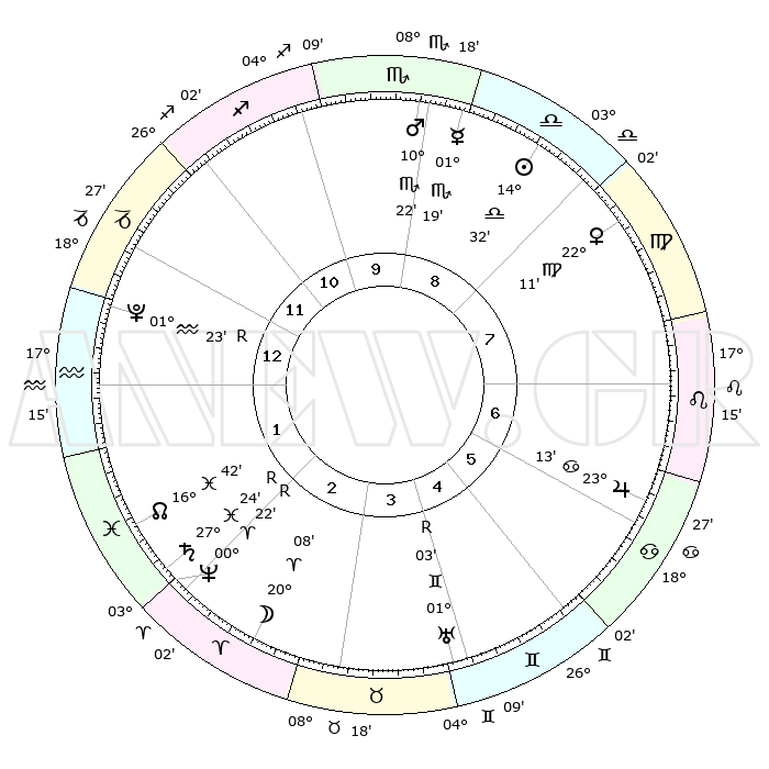 | ΘΕΣΕΙΣ ΠΛΑΝΗΤΩΝ ΑΣΤΡΟΛΟΓΙΚΟΥ ΧΑΡΤΗ ΤΗΣ ΣΤΙΓΜΗΣ ΑΥΤΗΣ | | Πλανήτης | Ζώδιο | Μοίρες | Δεκαήμ. | Σε οίκο | Απόκλιση | | Ακμές των οίκων | Ηλιος | Ζυγός | 14°27' | Δεύτερο | 9 | 05 S 42 | | 1ος | 09°05' | Αιγόκερως | Σελήνη | Κριός | 18°46' | Δεύτερο | 3 | 09 N 48 | | 2ος | 18°33' | Υδροχόος | Ερμής | Σκορπιός | 01°11' | Πρώτο | 9 | 12 S 42 | | 3ος | 28°51' | Ιχθείς | Αφροδίτη | Παρθένος | 22°04' | Τρίτο | 8 | 04 N 27 | | 4ος | 01°13' | Ταύρος | Αρης | Σκορπιός | 10°18' | Δεύτερο | 10 | 15 S 03 | | 5ος | 26°11' | Ταύρος | Δίας | Καρκίνος | 23°12' | Τρίτο | 7 | 21 N 28 | | 6ος | 17°32' | Δίδυμοι | Κρόνος | Ιχθείς | 27°25'R | Τρίτο | 2 | 03 S 20 | | 7ος | 09°05' | Καρκίνος | Ουρανός | Δίδυμοι | 01°04'R | Πρώτο | 5 | 20 N 10 | | 8ος | 18°33' | Λέων | Ποσειδώνας | Κριός | 00°22'R | Πρώτο | 3 | 01 S 07 | | 9ος | 28°51' | Παρθένος | Πλούτωνας | Υδροχόος | 01°23'R | Πρώτο | 1 | 23 S 32 | | 10ος | 01°13' | Σκορπιός | Β. Δεσμός | Ιχθείς | 16°42' | Δεύτερο | 2 | 05 S 15 | | 11ος | 26°11' | Σκορπιός | Ωροσκόπος | Αιγόκερως | 09°05' | Πρώτο | | | 12ος | 17°32' | Τοξότης | Μεσουράνημα | Σκορπιός | 01°13' | Πρώτο | | | |