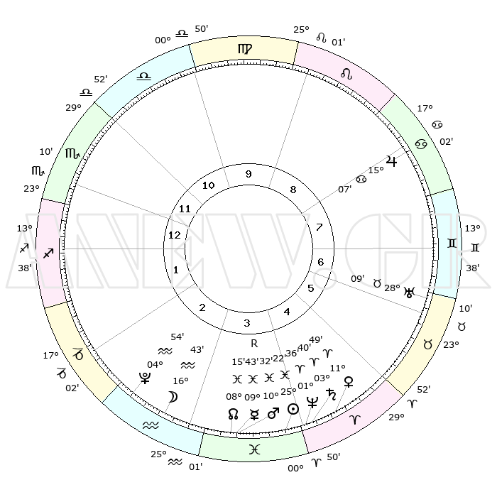| | ΘΕΣΕΙΣ ΠΛΑΝΗΤΩΝ ΑΣΤΡΟΛΟΓΙΚΟΥ ΧΑΡΤΗ ΤΗΣ ΣΤΙΓΜΗΣ ΑΥΤΗΣ | | | | Πλανήτης | Ζώδιο | Μοίρες | Δεκαήμ. | Σε οίκο | Απόκλιση | | Ακμές των οίκων | | Ηλιος | Ιχθείς | 25°18' | Τρίτο | 4 | 01 S 52 | | 1ος | 24°20' | Σκορπιός | | Σελήνη | Υδροχόος | 15°53' | Δεύτερο | 3 | 18 S 03 | | 2ος | 24°45' | Τοξότης | | Ερμής | Ιχθείς | 09°45'R | Πρώτο | 4 | 05 S 52 | | 3ος | 29°33' | Αιγόκερως | | Αφροδίτη | Κριός | 11°44' | Δεύτερο | 5 | 03 N 42 | | 4ος | 05°23' | Ιχθείς | | Αρης | Ιχθείς | 10°29' | Δεύτερο | 4 | 08 S 38 | | 5ος | 07°03' | Κριός | | Δίας | Καρκίνος | 15°07' | Δεύτερο | 8 | 22 N 56 | | 6ος | 02°53' | Ταύρος | | Κρόνος | Κριός | 03°39' | Πρώτο | 4 | 00 S 30 | | 7ος | 24°20' | Ταύρος | | Ουρανός | Ταύρος | 28°09' | Τρίτο | 7 | 19 N 34 | | 8ος | 24°45' | Δίδυμοι | | Ποσειδώνας | Κριός | 01°36' | Πρώτο | 4 | 00 S 34 | | 9ος | 29°33' | Καρκίνος | | Πλούτωνας | Υδροχόος | 04°54' | Πρώτο | 3 | 22 S 49 | | 10ος | 05°23' | Παρθένος | | Β. Δεσμός | Ιχθείς | 08°15' | Πρώτο | 4 | 08 S 28 | | 11ος | 07°03' | Ζυγός | | Ωροσκόπος | Σκορπιός | 24°20' | Τρίτο | | | 12ος | 02°53' | Σκορπιός | | Μεσουράνημα | Παρθένος | 05°23' | Πρώτο | | | |