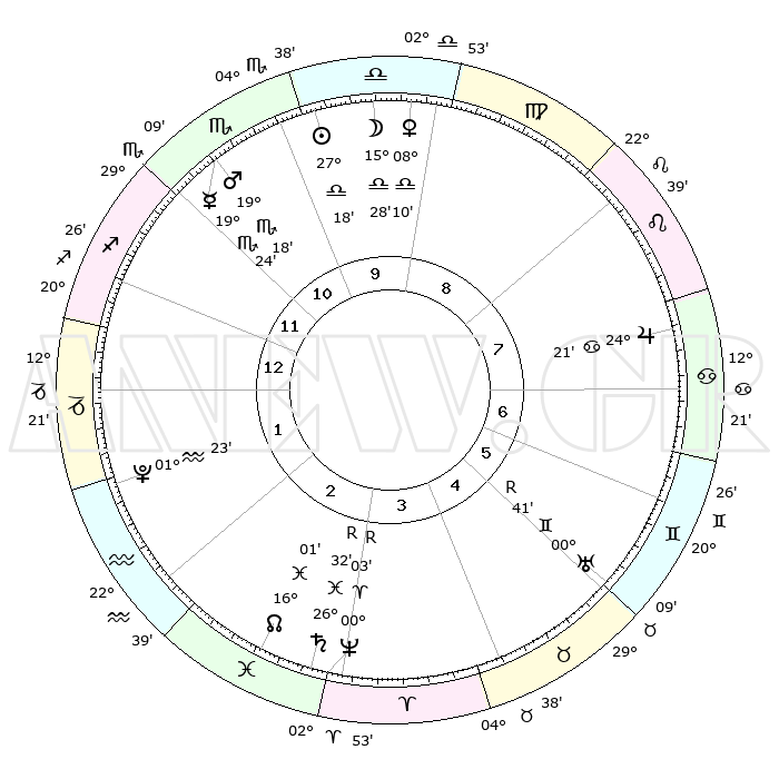| ΘΕΣΕΙΣ ΠΛΑΝΗΤΩΝ ΑΣΤΡΟΛΟΓΙΚΟΥ ΧΑΡΤΗ ΤΗΣ ΣΤΙΓΜΗΣ ΑΥΤΗΣ | | Πλανήτης | Ζώδιο | Μοίρες | Δεκαήμ. | Σε οίκο | Απόκλιση | | Ακμές των οίκων | Ηλιος | Ζυγός | 27°10' | Τρίτο | 11 | 10 S 28 | | 1ος | 00°49' | Τοξότης | Σελήνη | Ζυγός | 13°54' | Δεύτερο | 10 | 07 S 34 | | 2ος | 02°04' | Αιγόκερως | Ερμής | Σκορπιός | 19°14' | Δεύτερο | 12 | 19 S 42 | | 3ος | 07°54' | Υδροχόος | Αφροδίτη | Ζυγός | 07°60' | Πρώτο | 10 | 01 S 46 | | 4ος | 13°58' | Ιχθείς | Αρης | Σκορπιός | 19°13' | Δεύτερο | 12 | 17 S 48 | | 5ος | 14°54' | Κριός | Δίας | Καρκίνος | 24°21' | Τρίτο | 8 | 21 N 18 | | 6ος | 09°50' | Ταύρος | Κρόνος | Ιχθείς | 26°33'R | Τρίτο | 4 | 03 S 40 | | 7ος | 00°49' | Δίδυμοι | Ουρανός | Δίδυμοι | 00°41'R | Πρώτο | 6 | 20 N 05 | | 8ος | 02°04' | Καρκίνος | Ποσειδώνας | Κριός | 00°03'R | Πρώτο | 4 | 01 S 14 | | 9ος | 07°54' | Λέων | Πλούτωνας | Υδροχόος | 01°23' | Πρώτο | 2 | 23 S 32 | | 10ος | 13°58' | Παρθένος | Β. Δεσμός | Ιχθείς | 16°01' | Δεύτερο | 4 | 05 S 31 | | 11ος | 14°54' | Ζυγός | Ωροσκόπος | Τοξότης | 00°49' | Πρώτο | | | 12ος | 09°50' | Σκορπιός | Μεσουράνημα | Παρθένος | 13°58' | Δεύτερο | | | |