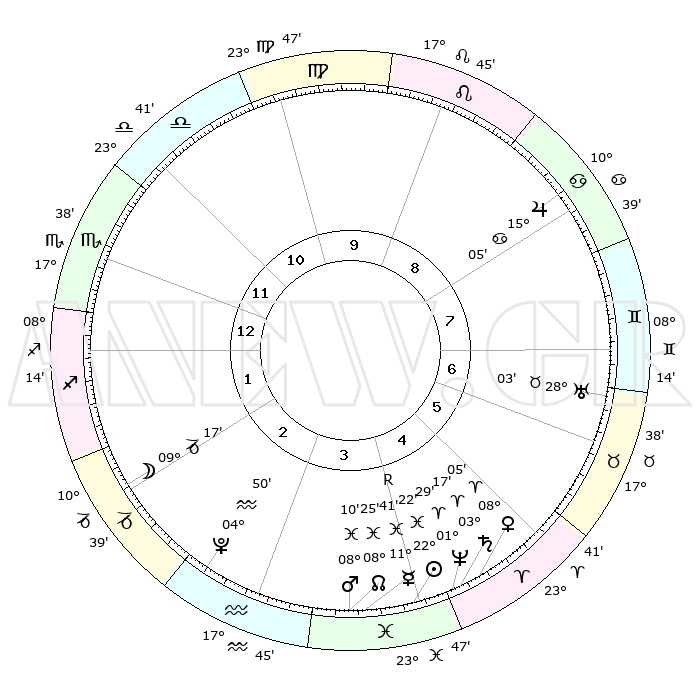 | | ΘΕΣΕΙΣ ΠΛΑΝΗΤΩΝ ΑΣΤΡΟΛΟΓΙΚΟΥ ΧΑΡΤΗ ΤΗΣ ΣΤΙΓΜΗΣ ΑΥΤΗΣ | | | | Πλανήτης | Ζώδιο | Μοίρες | Δεκαήμ. | Σε οίκο | Απόκλιση | | Ακμές των οίκων | | Ηλιος | Ιχθείς | 22°19' | Τρίτο | 4 | 03 S 03 | | 1ος | 25°23' | Σκορπιός | | Σελήνη | Αιγόκερως | 08°45' | Πρώτο | 2 | 27 S 43 | | 2ος | 25°55' | Τοξότης | | Ερμής | Ιχθείς | 11°43'R | Δεύτερο | 4 | 04 S 30 | | 3ος | 00°53' | Υδροχόος | | Αφροδίτη | Κριός | 08°02' | Πρώτο | 4 | 02 N 10 | | 4ος | 06°46' | Ιχθείς | | Αρης | Ιχθείς | 08°08' | Πρώτο | 4 | 09 S 32 | | 5ος | 08°20' | Κριός | | Δίας | Καρκίνος | 15°05' | Δεύτερο | 8 | 22 N 56 | | 6ος | 04°01' | Ταύρος | | Κρόνος | Κριός | 03°17' | Πρώτο | 4 | 00 S 39 | | 7ος | 25°23' | Ταύρος | | Ουρανός | Ταύρος | 28°03' | Τρίτο | 7 | 19 N 33 | | 8ος | 25°55' | Δίδυμοι | | Ποσειδώνας | Κριός | 01°29' | Πρώτο | 4 | 00 S 36 | | 9ος | 00°53' | Λέων | | Πλούτωνας | Υδροχόος | 04°50' | Πρώτο | 3 | 22 S 50 | | 10ος | 06°46' | Παρθένος | | Β. Δεσμός | Ιχθείς | 08°25' | Πρώτο | 4 | 08 S 25 | | 11ος | 08°20' | Ζυγός | | Ωροσκόπος | Σκορπιός | 25°23' | Τρίτο | | | 12ος | 04°01' | Σκορπιός | | Μεσουράνημα | Παρθένος | 06°46' | Πρώτο | | | |