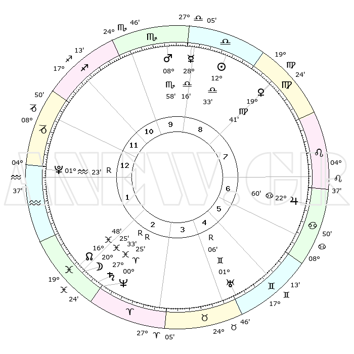 | ΘΕΣΕΙΣ ΠΛΑΝΗΤΩΝ ΑΣΤΡΟΛΟΓΙΚΟΥ ΧΑΡΤΗ ΤΗΣ ΣΤΙΓΜΗΣ ΑΥΤΗΣ | | Πλανήτης | Ζώδιο | Μοίρες | Δεκαήμ. | Σε οίκο | Απόκλιση | | Ακμές των οίκων | Ηλιος | Ζυγός | 12°26' | Δεύτερο | 9 | 04 S 55 | | 1ος | 25°06' | Τοξότης | Σελήνη | Ιχθείς | 18°53' | Δεύτερο | 3 | 04 S 21 | | 2ος | 01°03' | Υδροχόος | Ερμής | Ζυγός | 28°06' | Τρίτο | 10 | 11 S 23 | | 3ος | 10°36' | Ιχθείς | Αφροδίτη | Παρθένος | 19°33' | Δεύτερο | 9 | 05 N 25 | | 4ος | 15°16' | Κριός | Αρης | Σκορπιός | 08°54' | Πρώτο | 10 | 14 S 35 | | 5ος | 12°23' | Ταύρος | Δίας | Καρκίνος | 22°59' | Τρίτο | 7 | 21 N 30 | | 6ος | 04°33' | Δίδυμοι | Κρόνος | Ιχθείς | 27°33'R | Τρίτο | 3 | 03 S 17 | | 7ος | 25°06' | Δίδυμοι | Ουρανός | Δίδυμοι | 01°07'R | Πρώτο | 5 | 20 N 10 | | 8ος | 01°03' | Λέων | Ποσειδώνας | Κριός | 00°26'R | Πρώτο | 3 | 01 S 06 | | 9ος | 10°36' | Παρθένος | Πλούτωνας | Υδροχόος | 01°23'R | Πρώτο | 2 | 23 S 32 | | 10ος | 15°16' | Ζυγός | Β. Δεσμός | Ιχθείς | 16°48' | Δεύτερο | 3 | 05 S 12 | | 11ος | 12°23' | Σκορπιός | Ωροσκόπος | Τοξότης | 25°06' | Τρίτο | | | 12ος | 04°33' | Τοξότης | Μεσουράνημα | Ζυγός | 15°16' | Δεύτερο | | | |