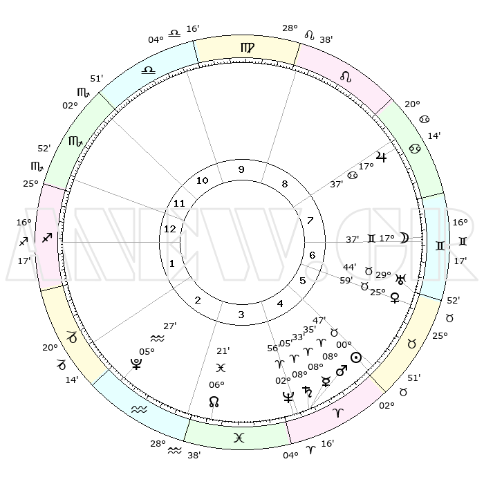 | | ΘΕΣΕΙΣ ΠΛΑΝΗΤΩΝ ΑΣΤΡΟΛΟΓΙΚΟΥ ΧΑΡΤΗ ΤΗΣ ΣΤΙΓΜΗΣ ΑΥΤΗΣ | | | | Πλανήτης | Ζώδιο | Μοίρες | Δεκαήμ. | Σε οίκο | Απόκλιση | | Ακμές των οίκων | | Ηλιος | Ταύρος | 00°43' | Πρώτο | 5 | 11 N 43 | | 1ος | 26°16' | Σκορπιός | | Σελήνη | Δίδυμοι | 16°37' | Δεύτερο | 7 | 27 N 46 | | 2ος | 26°54' | Τοξότης | | Ερμής | Κριός | 08°27' | Πρώτο | 4 | 00 N 57 | | 3ος | 02°00' | Υδροχόος | | Αφροδίτη | Ταύρος | 25°54' | Τρίτο | 6 | 19 N 39 | | 4ος | 07°56' | Ιχθείς | | Αρης | Κριός | 08°32' | Πρώτο | 4 | 02 N 30 | | 5ος | 09°24' | Κριός | | Δίας | Καρκίνος | 17°36' | Δεύτερο | 8 | 22 N 39 | | 6ος | 04°57' | Ταύρος | | Κρόνος | Κριός | 08°05' | Πρώτο | 4 | 01 N 14 | | 7ος | 26°16' | Ταύρος | | Ουρανός | Ταύρος | 29°43' | Τρίτο | 7 | 19 N 55 | | 8ος | 26°54' | Δίδυμοι | | Ποσειδώνας | Κριός | 02°56' | Πρώτο | 4 | 00 S 03 | | 9ος | 02°00' | Λέων | | Πλούτωνας | Υδροχόος | 05°27' | Πρώτο | 3 | 22 S 48 | | 10ος | 07°56' | Παρθένος | | Β. Δεσμός | Ιχθείς | 06°21' | Πρώτο | 3 | 09 S 11 | | 11ος | 09°24' | Ζυγός | | Ωροσκόπος | Σκορπιός | 26°16' | Τρίτο | | | 12ος | 04°57' | Σκορπιός | | Μεσουράνημα | Παρθένος | 07°56' | Πρώτο | | | |