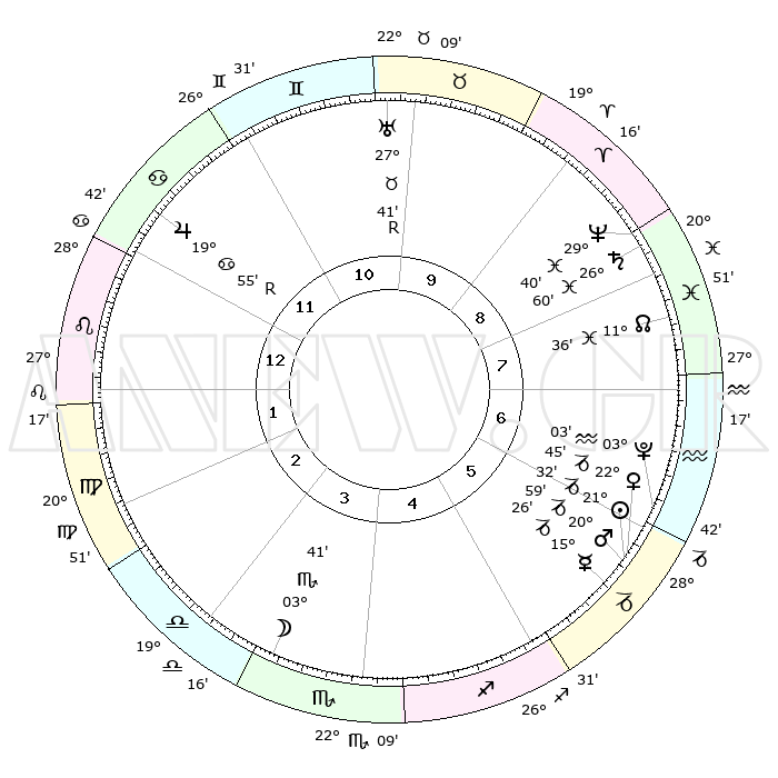 | | ΘΕΣΕΙΣ ΠΛΑΝΗΤΩΝ ΑΣΤΡΟΛΟΓΙΚΟΥ ΧΑΡΤΗ ΤΗΣ ΣΤΙΓΜΗΣ ΑΥΤΗΣ | | | | Πλανήτης | Ζώδιο | Μοίρες | Δεκαήμ. | Σε οίκο | Απόκλιση | | Ακμές των οίκων | | Ηλιος | Αιγόκερως | 21°16' | Τρίτο | 9 | 21 S 45 | | 1ος | 29°45' | Ταύρος | | Σελήνη | Σκορπιός | 00°25' | Πρώτο | 6 | 15 S 18 | | 2ος | 24°37' | Δίδυμοι | | Ερμής | Αιγόκερως | 15°00' | Δεύτερο | 8 | 24 S 08 | | 3ος | 16°02' | Καρκίνος | | Αφροδίτη | Αιγόκερως | 22°25' | Τρίτο | 9 | 22 S 26 | | 4ος | 08°47' | Λέων | | Αρης | Αιγόκερως | 20°46' | Τρίτο | 9 | 22 S 46 | | 5ος | 07°12' | Παρθένος | | Δίας | Καρκίνος | 19°57'R | Δεύτερο | 3 | 22 N 13 | | 6ος | 15°37' | Ζυγός | | Κρόνος | Ιχθείς | 26°59' | Τρίτο | 11 | 03 S 15 | | 7ος | 29°45' | Σκορπιός | | Ουρανός | Ταύρος | 27°42'R | Τρίτο | 12 | 19 N 27 | | 8ος | 24°37' | Τοξότης | | Ποσειδώνας | Ιχθείς | 29°40' | Τρίτο | 11 | 01 S 21 | | 9ος | 16°02' | Αιγόκερως | | Πλούτωνας | Υδροχόος | 03°03' | Πρώτο | 9 | 23 S 09 | | 10ος | 08°47' | Υδροχόος | | Β. Δεσμός | Ιχθείς | 11°37' | Δεύτερο | 11 | 07 S 12 | | 11ος | 07°12' | Ιχθείς | | Ωροσκόπος | Ταύρος | 29°45' | Τρίτο | | | 12ος | 15°37' | Κριός | | Μεσουράνημα | Υδροχόος | 08°47' | Πρώτο | | | |