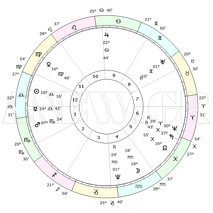 | ΘΕΣΕΙΣ ΠΛΑΝΗΤΩΝ ΑΣΤΡΟΛΟΓΙΚΟΥ ΧΑΡΤΗ ΤΗΣ ΣΤΙΓΜΗΣ ΑΥΤΗΣ | | Πλανήτης | Ζώδιο | Μοίρες | Δεκαήμ. | Σε οίκο | Απόκλιση | | Ακμές των οίκων | Ηλιος | Ζυγός | 10°12' | Δεύτερο | 1 | 04 S 02 | | 1ος | 00°52' | Ζυγός | Σελήνη | Υδροχόος | 17°19' | Δεύτερο | 5 | 18 S 13 | | 2ος | 27°31' | Ζυγός | Ερμής | Ζυγός | 24°35' | Τρίτο | 1 | 09 S 52 | | 3ος | 27°59' | Σκορπιός | Αφροδίτη | Παρθένος | 16°44' | Δεύτερο | 12 | 06 N 28 | | 4ος | 00°59' | Αιγόκερως | Αρης | Σκορπιός | 07°21' | Πρώτο | 2 | 14 S 03 | | 5ος | 03°57' | Υδροχόος | Δίας | Καρκίνος | 22°43' | Τρίτο | 10 | 21 N 33 | | 6ος | 04°21' | Ιχθείς | Κρόνος | Ιχθείς | 27°44'R | Τρίτο | 6 | 03 S 13 | | 7ος | 00°52' | Κριός | Ουρανός | Δίδυμοι | 01°10'R | Πρώτο | 9 | 20 N 11 | | 8ος | 27°31' | Κριός | Ποσειδώνας | Κριός | 00°29'R | Πρώτο | 6 | 01 S 04 | | 9ος | 27°59' | Ταύρος | Πλούτωνας | Υδροχόος | 01°24'R | Πρώτο | 4 | 23 S 32 | | 10ος | 00°59' | Καρκίνος | Β. Δεσμός | Ιχθείς | 16°56' | Δεύτερο | 6 | 05 S 10 | | 11ος | 03°57' | Λέων | Ωροσκόπος | Ζυγός | 00°52' | Πρώτο | | | 12ος | 04°21' | Παρθένος | Μεσουράνημα | Καρκίνος | 00°59' | Πρώτο | | | |