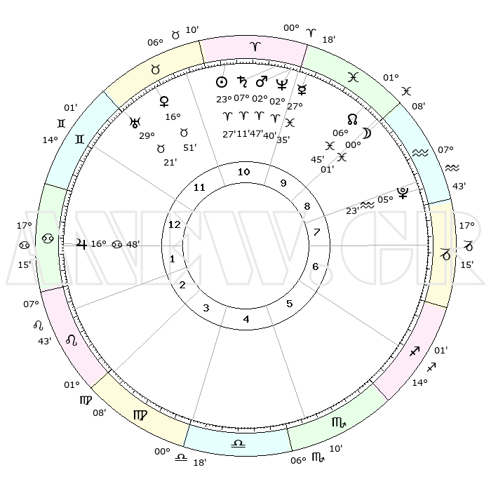 | | ΘΕΣΕΙΣ ΠΛΑΝΗΤΩΝ ΑΣΤΡΟΛΟΓΙΚΟΥ ΧΑΡΤΗ ΤΗΣ ΣΤΙΓΜΗΣ ΑΥΤΗΣ | | | | Πλανήτης | Ζώδιο | Μοίρες | Δεκαήμ. | Σε οίκο | Απόκλιση | | Ακμές των οίκων | | Ηλιος | Κριός | 23°23' | Τρίτο | 11 | 09 N 05 | | 1ος | 25°17' | Δίδυμοι | | Σελήνη | Υδροχόος | 29°07' | Τρίτο | 9 | 12 S 32 | | 2ος | 16°25' | Καρκίνος | | Ερμής | Ιχθείς | 27°29' | Τρίτο | 10 | 03 S 19 | | 3ος | 07°57' | Λέων | | Αφροδίτη | Ταύρος | 16°45' | Δεύτερο | 11 | 16 N 56 | | 4ος | 03°33' | Παρθένος | | Αρης | Κριός | 02°44' | Πρώτο | 10 | 00 N 10 | | 5ος | 06°41' | Ζυγός | | Δίας | Καρκίνος | 16°48' | Δεύτερο | 2 | 22 N 45 | | 6ος | 16°56' | Σκορπιός | | Κρόνος | Κριός | 07°11' | Πρώτο | 11 | 00 N 53 | | 7ος | 25°17' | Τοξότης | | Ουρανός | Ταύρος | 29°20' | Τρίτο | 12 | 19 N 50 | | 8ος | 16°25' | Αιγόκερως | | Ποσειδώνας | Κριός | 02°40' | Πρώτο | 10 | 00 S 09 | | 9ος | 07°57' | Υδροχόος | | Πλούτωνας | Υδροχόος | 05°23' | Πρώτο | 8 | 22 S 47 | | 10ος | 03°33' | Ιχθείς | | Β. Δεσμός | Ιχθείς | 06°45' | Πρώτο | 10 | 09 S 02 | | 11ος | 06°41' | Κριός | | Ωροσκόπος | Δίδυμοι | 25°17' | Τρίτο | | | 12ος | 16°56' | Ταύρος | | Μεσουράνημα | Ιχθείς | 03°33' | Πρώτο | | | |