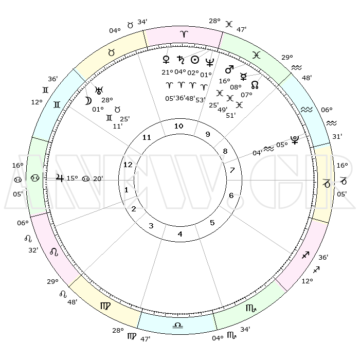 | | ΘΕΣΕΙΣ ΠΛΑΝΗΤΩΝ ΑΣΤΡΟΛΟΓΙΚΟΥ ΧΑΡΤΗ ΤΗΣ ΣΤΙΓΜΗΣ ΑΥΤΗΣ | | | | Πλανήτης | Ζώδιο | Μοίρες | Δεκαήμ. | Σε οίκο | Απόκλιση | | Ακμές των οίκων | | Ηλιος | Κριός | 02°44' | Πρώτο | 10 | 01 N 05 | | 1ος | 22°30' | Δίδυμοι | | Σελήνη | Δίδυμοι | 00°08' | Πρώτο | 12 | 25 N 13 | | 2ος | 13°54' | Καρκίνος | | Ερμής | Ιχθείς | 08°48' | Πρώτο | 10 | 07 S 55 | | 3ος | 05°18' | Λέων | | Αφροδίτη | Κριός | 20°59' | Τρίτο | 11 | 07 N 28 | | 4ος | 00°30' | Παρθένος | | Αρης | Ιχθείς | 16°21' | Δεύτερο | 10 | 06 S 22 | | 5ος | 03°08' | Ζυγός | | Δίας | Καρκίνος | 15°20' | Δεύτερο | 2 | 22 N 55 | | 6ος | 13°26' | Σκορπιός | | Κρόνος | Κριός | 04°35' | Πρώτο | 11 | 00 S 08 | | 7ος | 22°30' | Τοξότης | | Ουρανός | Ταύρος | 28°25' | Τρίτο | 12 | 19 N 38 | | 8ος | 13°54' | Αιγόκερως | | Ποσειδώνας | Κριός | 01°53' | Πρώτο | 10 | 00 S 27 | | 9ος | 05°18' | Υδροχόος | | Πλούτωνας | Υδροχόος | 05°04' | Πρώτο | 8 | 22 S 48 | | 10ος | 00°30' | Ιχθείς | | Β. Δεσμός | Ιχθείς | 07°52' | Πρώτο | 10 | 08 S 37 | | 11ος | 03°08' | Κριός | | Ωροσκόπος | Δίδυμοι | 22°30' | Τρίτο | | | 12ος | 13°26' | Ταύρος | | Μεσουράνημα | Ιχθείς | 00°30' | Πρώτο | | | |
