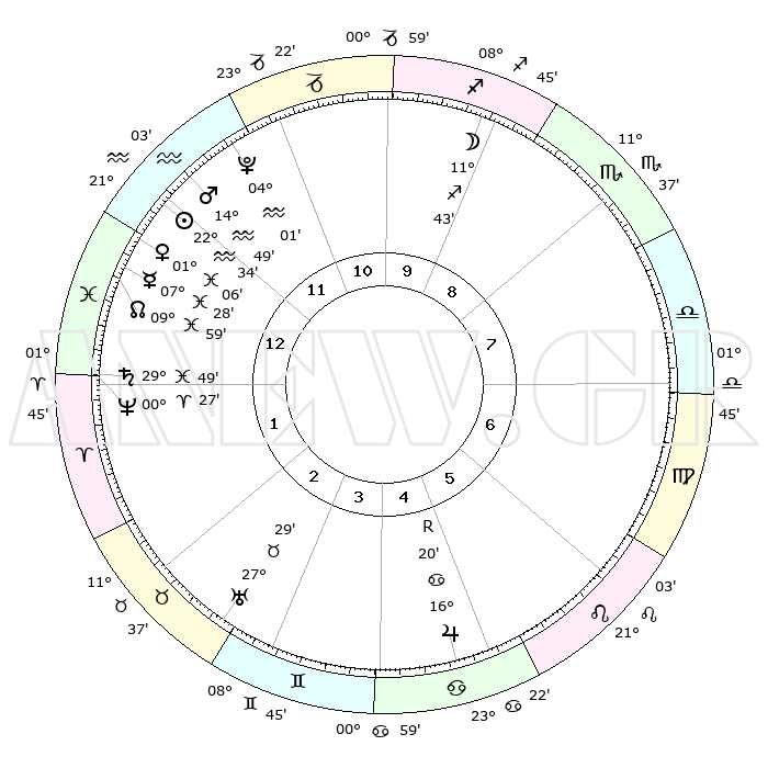 | | ΘΕΣΕΙΣ ΠΛΑΝΗΤΩΝ ΑΣΤΡΟΛΟΓΙΚΟΥ ΧΑΡΤΗ ΤΗΣ ΣΤΙΓΜΗΣ ΑΥΤΗΣ | | | | Πλανήτης | Ζώδιο | Μοίρες | Δεκαήμ. | Σε οίκο | Απόκλιση | | Ακμές των οίκων | | Ηλιος | Υδροχόος | 22°30' | Τρίτο | 12 | 14 S 01 | | 1ος | 28°04' | Υδροχόος | | Σελήνη | Τοξότης | 11°01' | Δεύτερο | 9 | 27 S 17 | | 2ος | 13°37' | Κριός | | Ερμής | Ιχθείς | 07°22' | Πρώτο | 1 | 09 S 27 | | 3ος | 16°43' | Ταύρος | | Αφροδίτη | Ιχθείς | 01°01' | Πρώτο | 1 | 12 S 28 | | 4ος | 11°19' | Δίδυμοι | | Αρης | Υδροχόος | 14°46' | Δεύτερο | 12 | 17 S 26 | | 5ος | 03°01' | Καρκίνος | | Δίας | Καρκίνος | 16°20'R | Δεύτερο | 5 | 22 N 45 | | 6ος | 26°22' | Καρκίνος | | Κρόνος | Ιχθείς | 29°49' | Τρίτο | 1 | 02 S 03 | | 7ος | 28°04' | Λέων | | Ουρανός | Ταύρος | 27°29' | Τρίτο | 3 | 19 N 25 | | 8ος | 13°37' | Ζυγός | | Ποσειδώνας | Κριός | 00°27' | Πρώτο | 1 | 01 S 02 | | 9ος | 16°43' | Σκορπιός | | Πλούτωνας | Υδροχόος | 04°01' | Πρώτο | 12 | 22 S 58 | | 10ος | 11°19' | Τοξότης | | Β. Δεσμός | Ιχθείς | 09°59' | Πρώτο | 1 | 07 S 49 | | 11ος | 03°01' | Αιγόκερως | | Ωροσκόπος | Υδροχόος | 28°04' | Τρίτο | | | 12ος | 26°22' | Αιγόκερως | | Μεσουράνημα | Τοξότης | 11°19' | Δεύτερο | | | |
