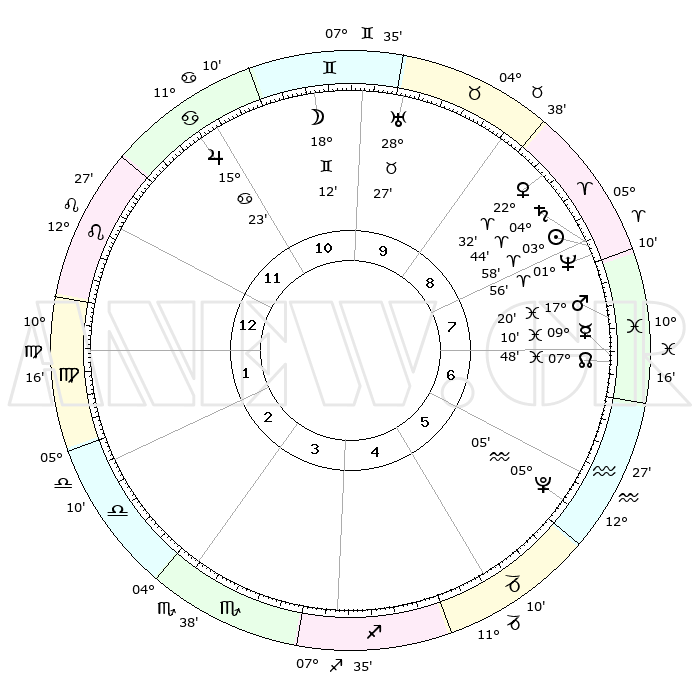 | | ΘΕΣΕΙΣ ΠΛΑΝΗΤΩΝ ΑΣΤΡΟΛΟΓΙΚΟΥ ΧΑΡΤΗ ΤΗΣ ΣΤΙΓΜΗΣ ΑΥΤΗΣ | | | | Πλανήτης | Ζώδιο | Μοίρες | Δεκαήμ. | Σε οίκο | Απόκλιση | | Ακμές των οίκων | | Ηλιος | Κριός | 03°54' | Πρώτο | 8 | 01 N 33 | | 1ος | 20°39' | Λέων | | Σελήνη | Δίδυμοι | 17°14' | Δεύτερο | 10 | 27 N 58 | | 2ος | 13°32' | Παρθένος | | Ερμής | Ιχθείς | 09°09' | Πρώτο | 7 | 08 S 02 | | 3ος | 11°15' | Ζυγός | | Αφροδίτη | Κριός | 22°27' | Τρίτο | 9 | 08 N 03 | | 4ος | 13°56' | Σκορπιός | | Αρης | Ιχθείς | 17°17' | Δεύτερο | 8 | 06 S 00 | | 5ος | 18°48' | Τοξότης | | Δίας | Καρκίνος | 15°23' | Δεύτερο | 11 | 22 N 55 | | 6ος | 21°38' | Αιγόκερως | | Κρόνος | Κριός | 04°44' | Πρώτο | 8 | 00 S 04 | | 7ος | 20°39' | Υδροχόος | | Ουρανός | Ταύρος | 28°27' | Τρίτο | 10 | 19 N 39 | | 8ος | 13°32' | Ιχθείς | | Ποσειδώνας | Κριός | 01°56' | Πρώτο | 8 | 00 S 26 | | 9ος | 11°15' | Κριός | | Πλούτωνας | Υδροχόος | 05°05' | Πρώτο | 6 | 22 S 48 | | 10ος | 13°56' | Ταύρος | | Β. Δεσμός | Ιχθείς | 07°48' | Πρώτο | 7 | 08 S 39 | | 11ος | 18°48' | Δίδυμοι | | Ωροσκόπος | Λέων | 20°39' | Τρίτο | | | 12ος | 21°38' | Καρκίνος | | Μεσουράνημα | Ταύρος | 13°56' | Δεύτερο | | | |